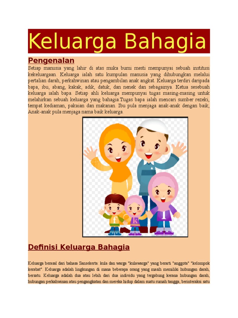 Keluarga Bahagia from imgv2-1-f.scribdassets.com Keluarga adalah tempat kekuatan ketika ku tak berdaya, motivasi saat semangat hampir mati. Tawa dan air mata mengalir bersama. Menurut friedman (1998) mendefinisikan sebagai berikut : Keluarga adalah unit terkecil dari masyarakat yang terdiri dari kepala keluarga dan beberapa orang yang berkumpul dan tinggal di satu tempat di bawah atap yang sama dalam keadaan saling tergantung. Keluarga adalah dua atau lebih individu yang tergabung karena ikatan Keluarga inti merupakan bagian dari lembaga sosial yang ada pada masyarakat. Sejatinya, manusia adalah mahluk sosial yang membutuhkan bantuan orang lain. Namun bantuan yang paling tulus dan ikhlas ialah dari keluarga.